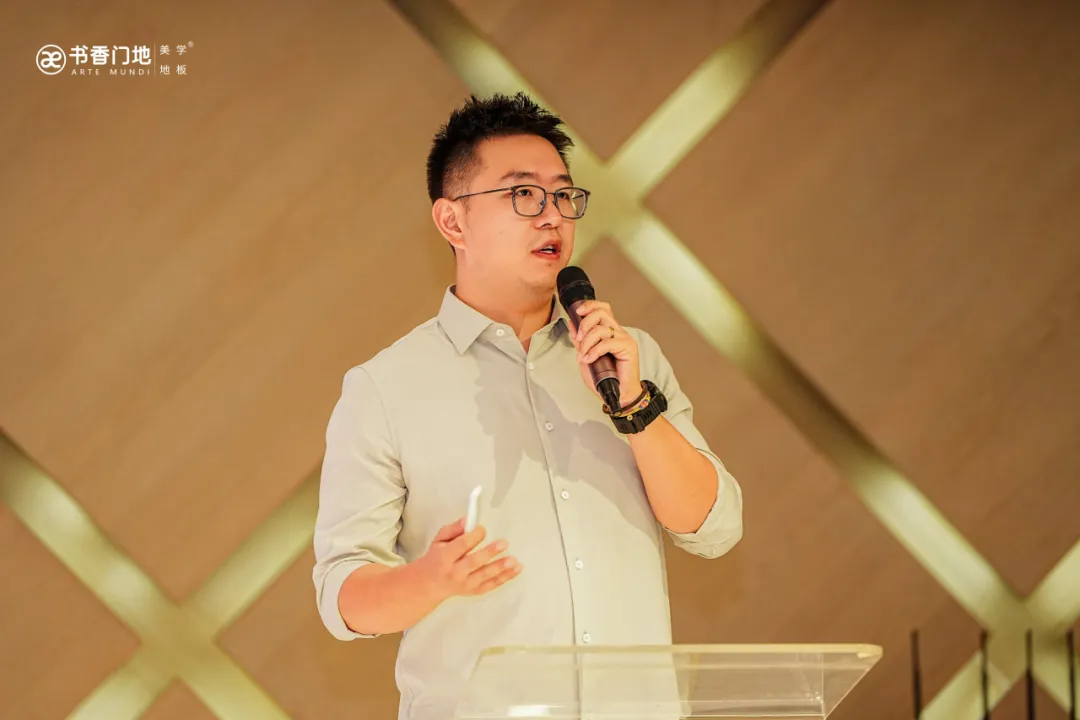 ▲书香门地集团产品部总经理助理邓富介 分享《中小工程常用产品介绍+纯实木地板》